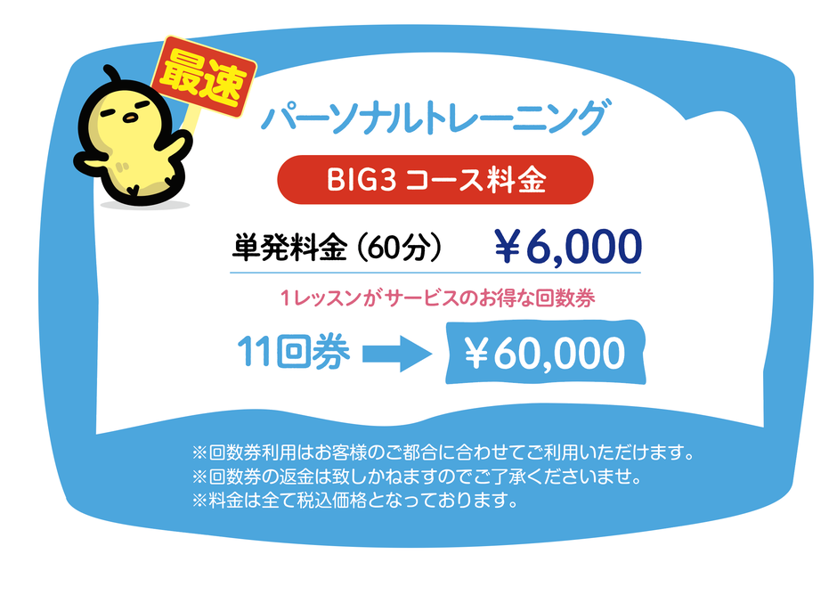 BIG3 100kgを最短で達成する為の、効率良く、怪我をしにくい安全なフォームを指導。トレーニング初心者にありがちなBIG3種目のエラー動作を修正し、個人に合わせた最適なフォームを見つけます。トレーニングメニューを成長レベルに合わせて段階別に作成指導致します。